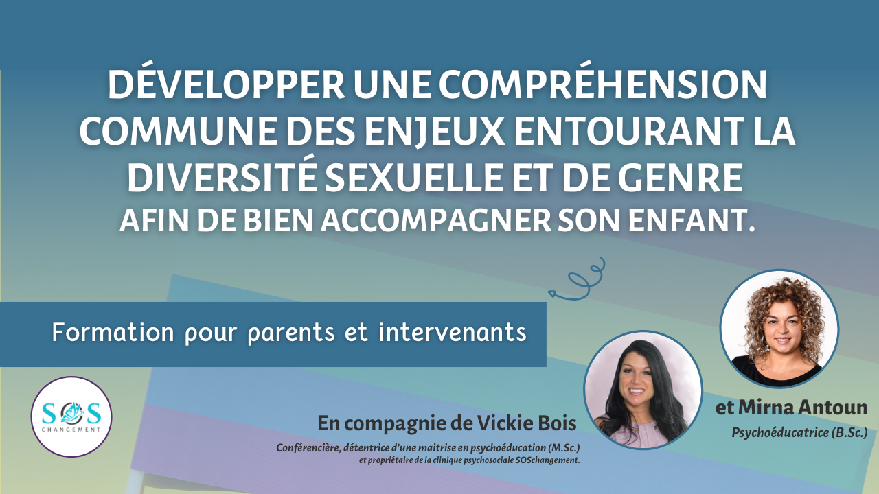 Présenté par Vickie Bois, Psychoéducatrice (M.Sc.) et propriétaire de la clinique psychosociale SOSchangement ainsi que Mirna Antoun, Psychoéducatrice (B.Sc.).